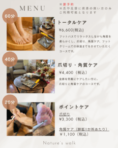 爪切り・角質ケアをメインに、お時間と内容別に3種類のコースをご用意しております。